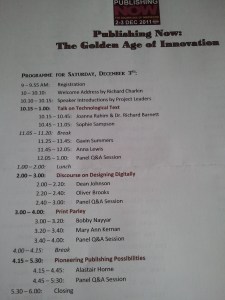 Yesterday, I went to the Publishing Now conference. (The day before was the debate). The main focus of the this conference was how the industry is effected by the digitization of print media. As an author, it was good hear to what members of the publishing industry think about the future of their profession. And the consensus seems to be that the publishing industry is strong enough to survive the digital attack its under. There was mention that the industry needs to find way to build a stronger connection with readers who are a building their own communities without the industry in it.