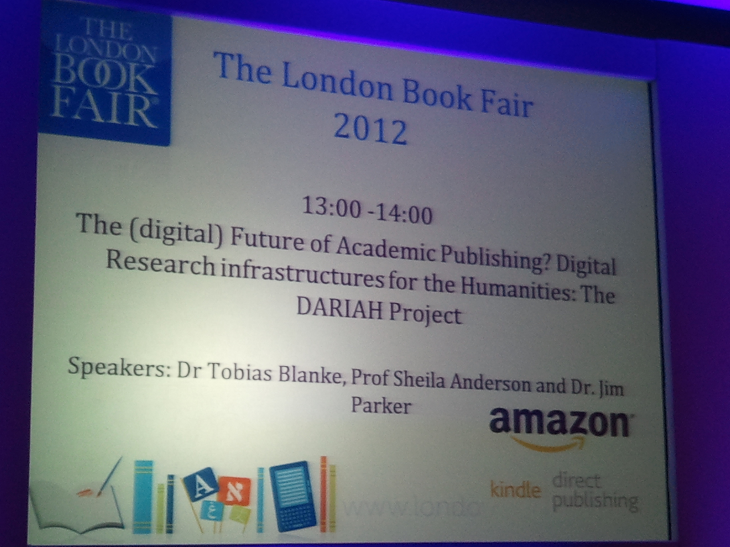 Day 2 (4/17/12). My day started late, well later than I wanted. I wanted to be at Earl’s Court by 9. I got there by 10. I missed a talk that I think would have been interesting. “Contract Copyright, Collaborate, and Communicate: The 4 C’s of successful publishing business models in the 21st century.” I’m going to try to sift through the twitter feed . Maybe I can find out how good it was. One thing I’m going to stress to LBF for next year is that they require all seminars to have their own hashtag that way people can follow. There’s a lot going on there and it would just make life easier. Really it’s only fitting since we’re all surrounded by social media. Most of the talks cover digital media at some point. So, you know…